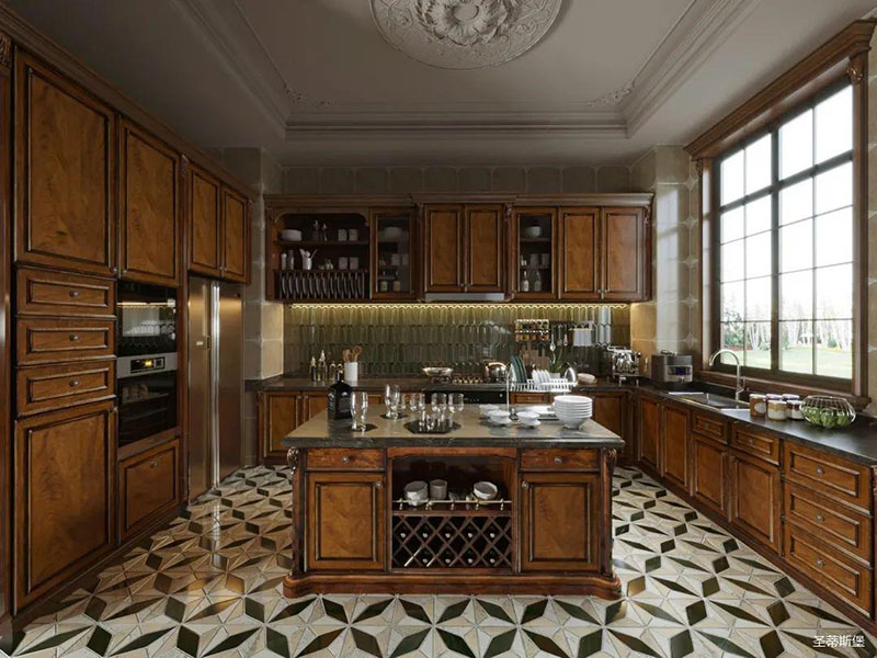 廚房為工字造型,櫥柜貼墻而立,廚具一應俱全。家具造型典雅,又無過多繁雜裝飾,原木懷舊工藝,展現了美國早期開拓精神與崇高自然的原則。嵌入式電器在填補空間的同時也帶來了滿滿的金屬質感。杯具隨意擺放,家人在廚房忙碌的身影隨即映入眼簾。