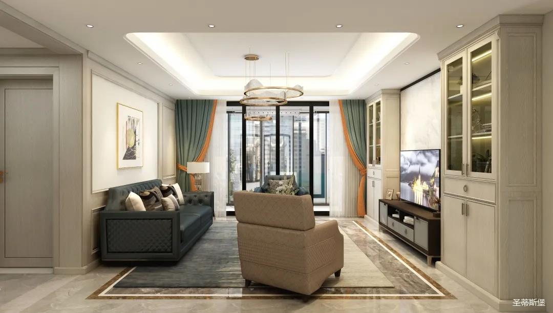 ▲室內的環形水晶吊燈,讓空間明亮而高級,淡雅內斂的洛卡灰,在些許愛馬仕橙的亮色點綴下,讓空間色彩跳脫又靈動。飄窗設計,使光線毫無保留的散落空間,臥室通過自然光線與實木的洗禮,充滿著溫暖陽光的氣息。