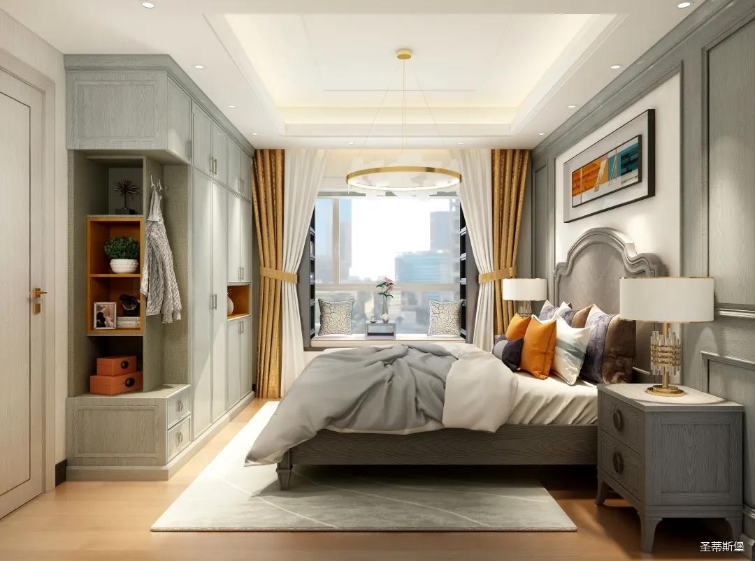 ▲臥室是居家的主要休息場所,在設計上需更注重舒適度。所以房間就以和諧淡雅的色彩為主,采用素雅柔和的線條布局,時尚輕奢的家具,使得空間更加的愜意和浪漫。床頭層林盡染裝飾畫,讓原本略偏美式淡雅的臥室在色彩上更添一筆。