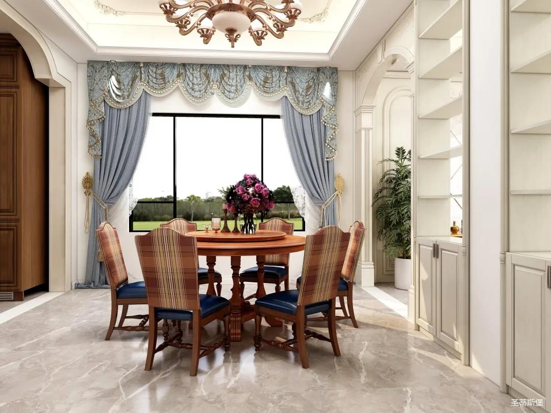 新古典風格中填入少量的傳統裝飾,與美式和諧相融。精細的實木手工雕刻,傳統形狀的基礎韻味與美式的細節取長補短。不但富有審美的愉悅,更重要的是令居住舒適而貼近自然。背景墻更是復古與潮流的完美結合,具有經典卻簡潔的圖案、復古卻時尚的色彩,既包含了古典風格的文化底蘊,也體現了現代流行的元素。