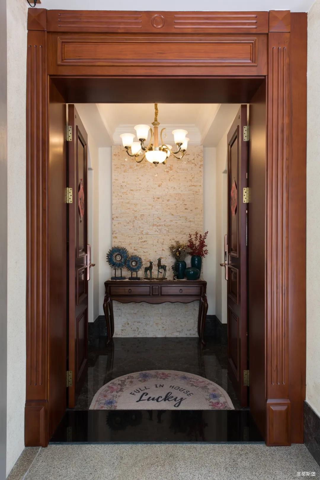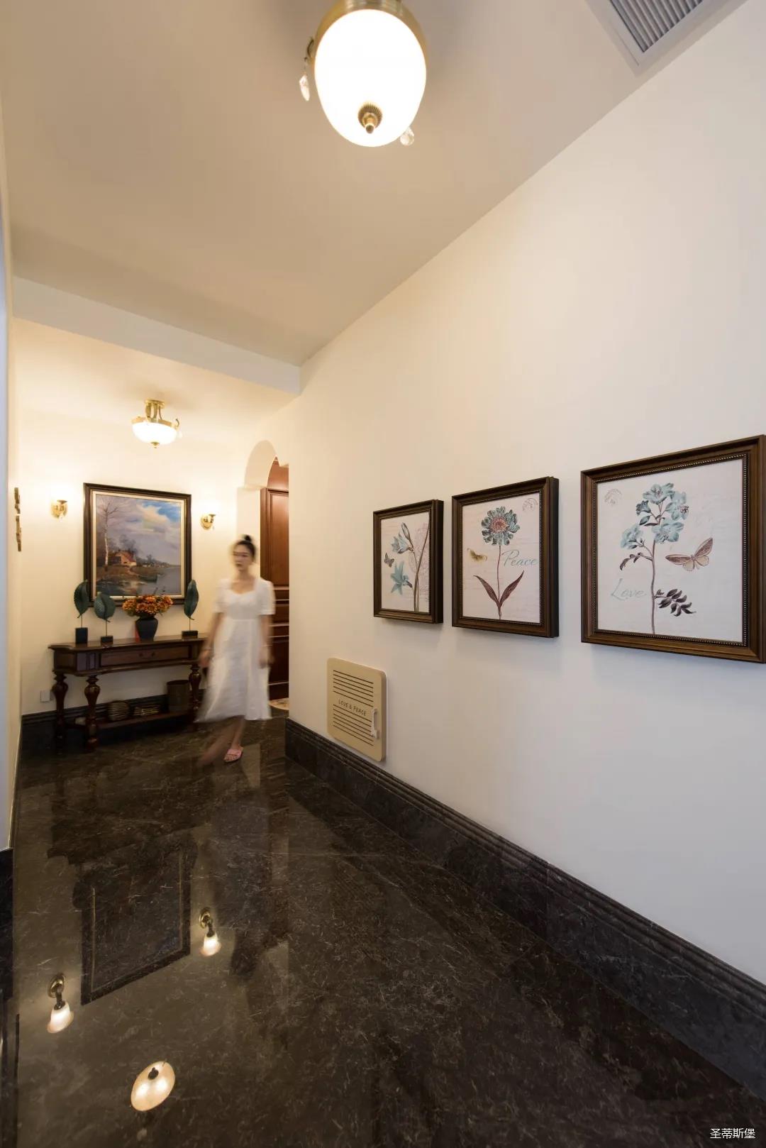 入戶玄關(guān)雙開門設(shè)計,儀式感滿滿!地面定制的瓷磚貼花設(shè)計,典雅又大方。核桃實木玄關(guān)桌,加上精致的擺件,經(jīng)典美式復(fù)古吊燈,不著痕跡的展現(xiàn)出居者對生活的激情,魅力吸睛,從入戶開始感受古典氛圍。