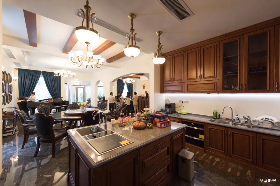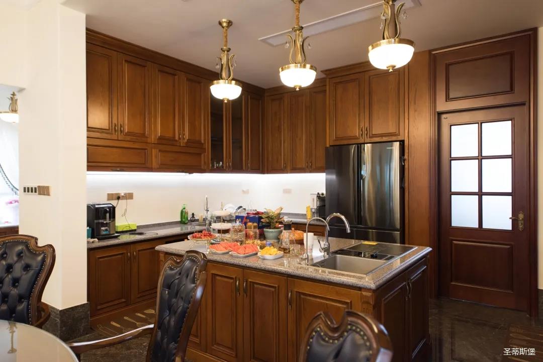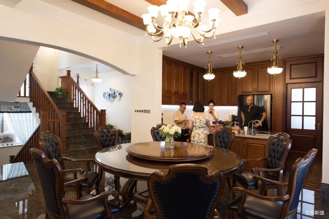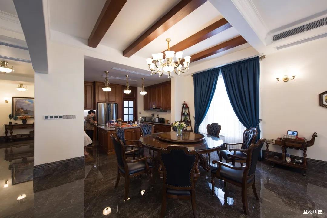 玄關(guān)進入轉(zhuǎn)角處,以穩(wěn)重大氣實木為主色調(diào)的開放式中西餐廚空間,將一體化無隔斷設(shè)計貫徹到每個細(xì)節(jié),采用了親膚真皮質(zhì)感的餐椅,手工雕刻的曲線讓原本硬朗的空間變得格外優(yōu)雅,自上而下,構(gòu)成完整的美式空間氣度,在每天的生活點滴間,沉浸在美式風(fēng)情中,更加隨性舒適。