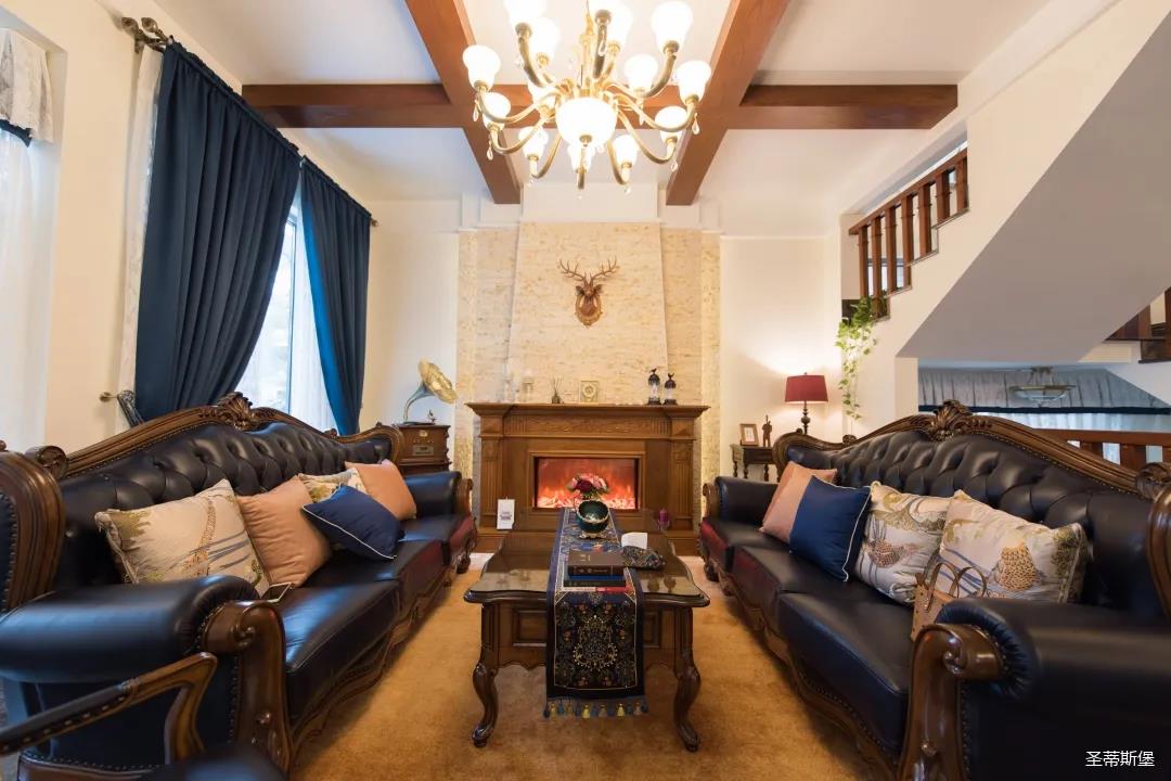 歐美實木吊頂設(shè)計,與沙發(fā)茶幾上下呼應(yīng),相得益彰,提升了空間層次感。
