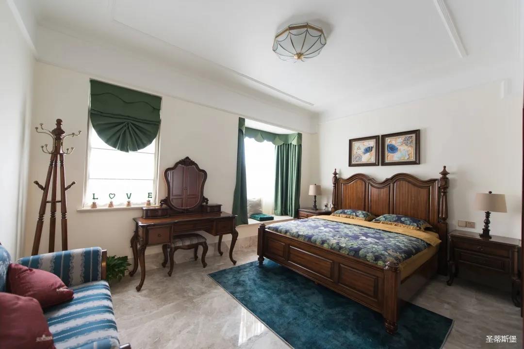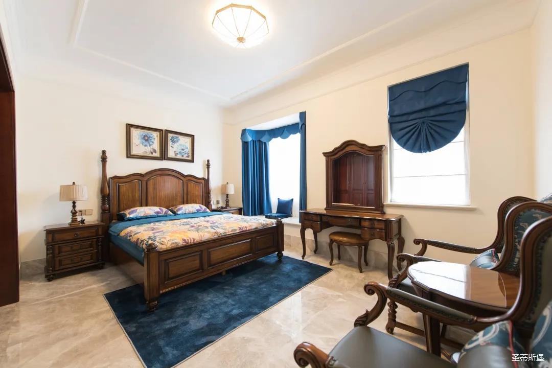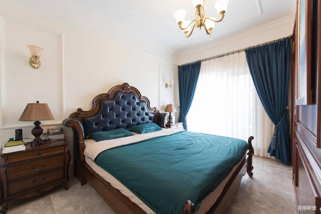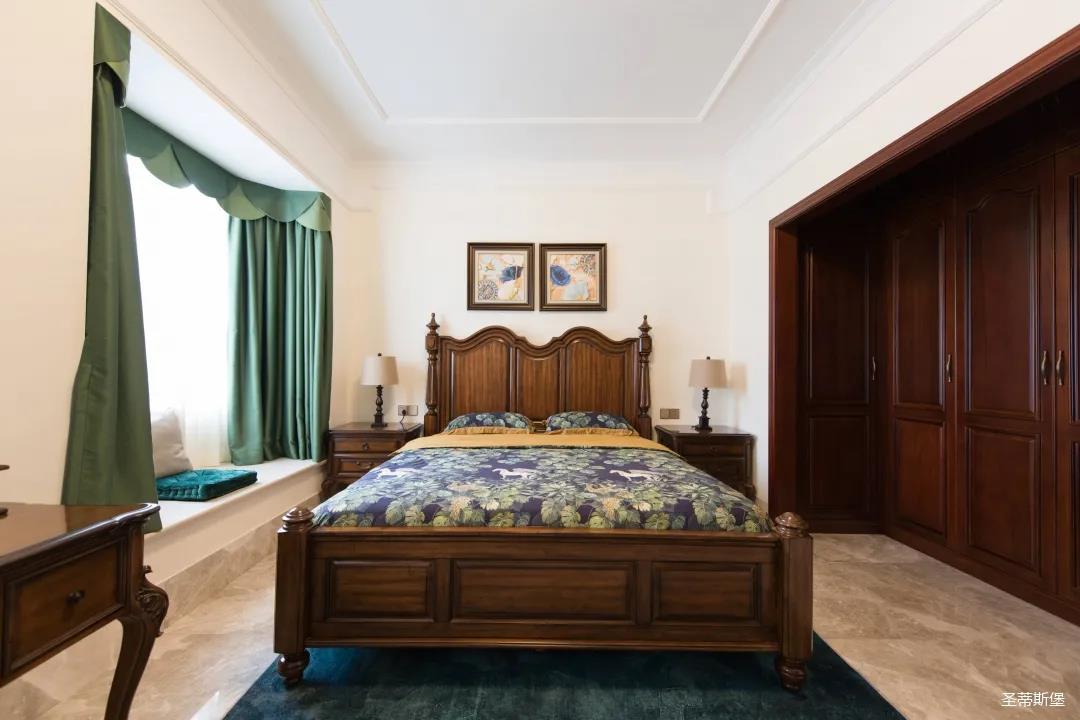 三樓是兩間臥房,每一間臥室都有自己的特定屬性。主人房端莊優(yōu)雅,雍容盡顯;墻面以簡潔的美式石膏線修飾,波浪形的實木床屏上點綴著太陽形狀的手工雕花,宛如海平面上剛出升的太陽,讓整個空間色彩奔放。