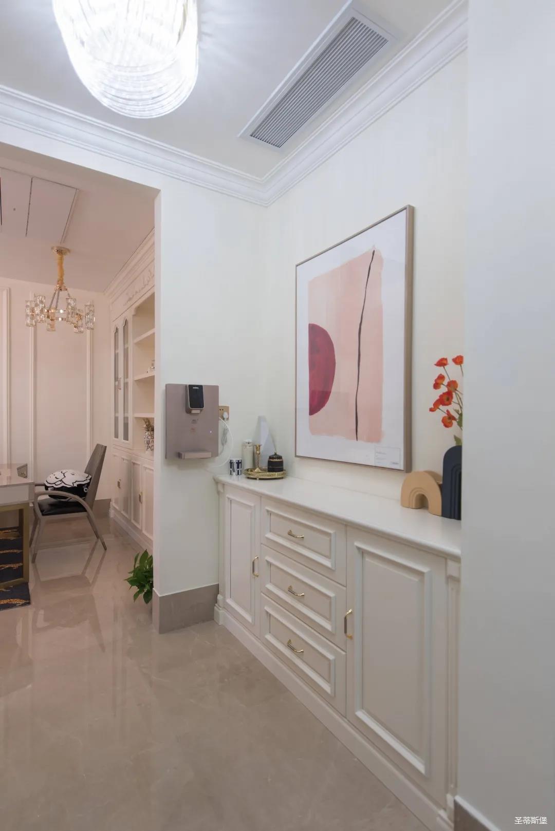 經(jīng)過房間玄關(guān)過道,一眼就被這夢幻的景象給征服,摒棄繁雜,少許的金色元素點綴,予以空間輕奢細(xì)膩的質(zhì)感,卻又不失美式韻味。