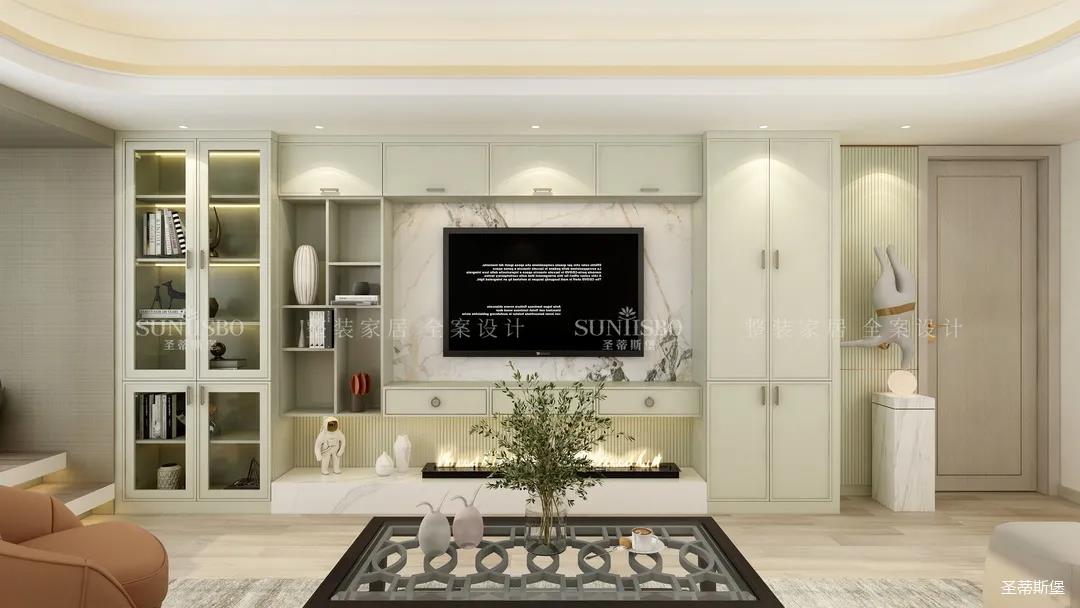 電視墻在客廳除了承擔著整體美觀之外,在小戶型的收納上也能承擔一些其他功能,比如小戶型收納問題。如果你家有強烈收納需求,可以選擇定制柜體墻面,做成整墻收納柜體,安裝無拉手柜面,既滿足了日常收納需求,也融合了美觀的裝飾效果。