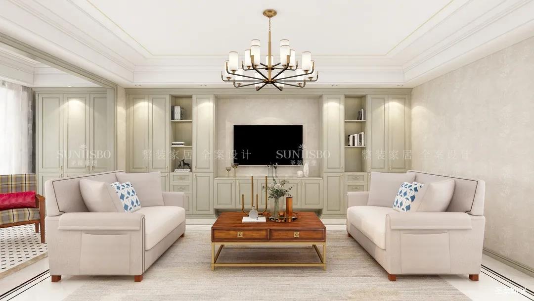 它以英倫爵士灰為柜體主調,背景墻定制了整墻的儲物柜,色調懷舊復古的同時還夾帶著時尚摩登氣息,明暗收納合理分區(qū),電視被實木飾面包圍,使空間視覺得以延伸,美觀收納兩不誤。