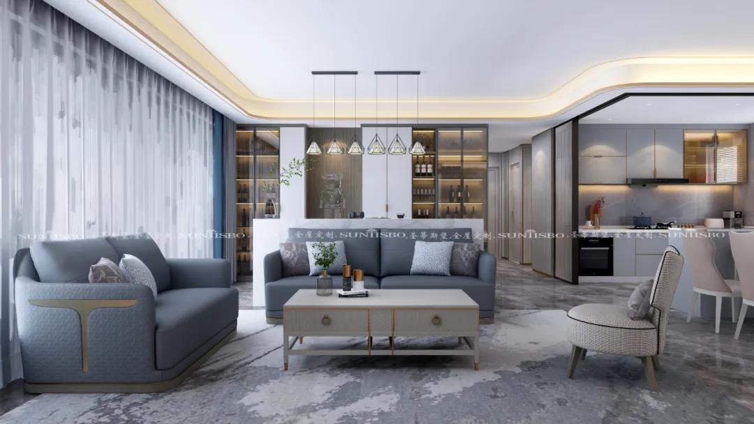 現(xiàn)代戶型更是迎合了這種簡約趨勢,將客餐廳設計在同一水平線上,還可以考慮在墻體做壁龕設計,把電視嵌入墻體內部,讓客廳空間一體式立面效果更整潔,空間的整體感更強,動線也更加流暢。
