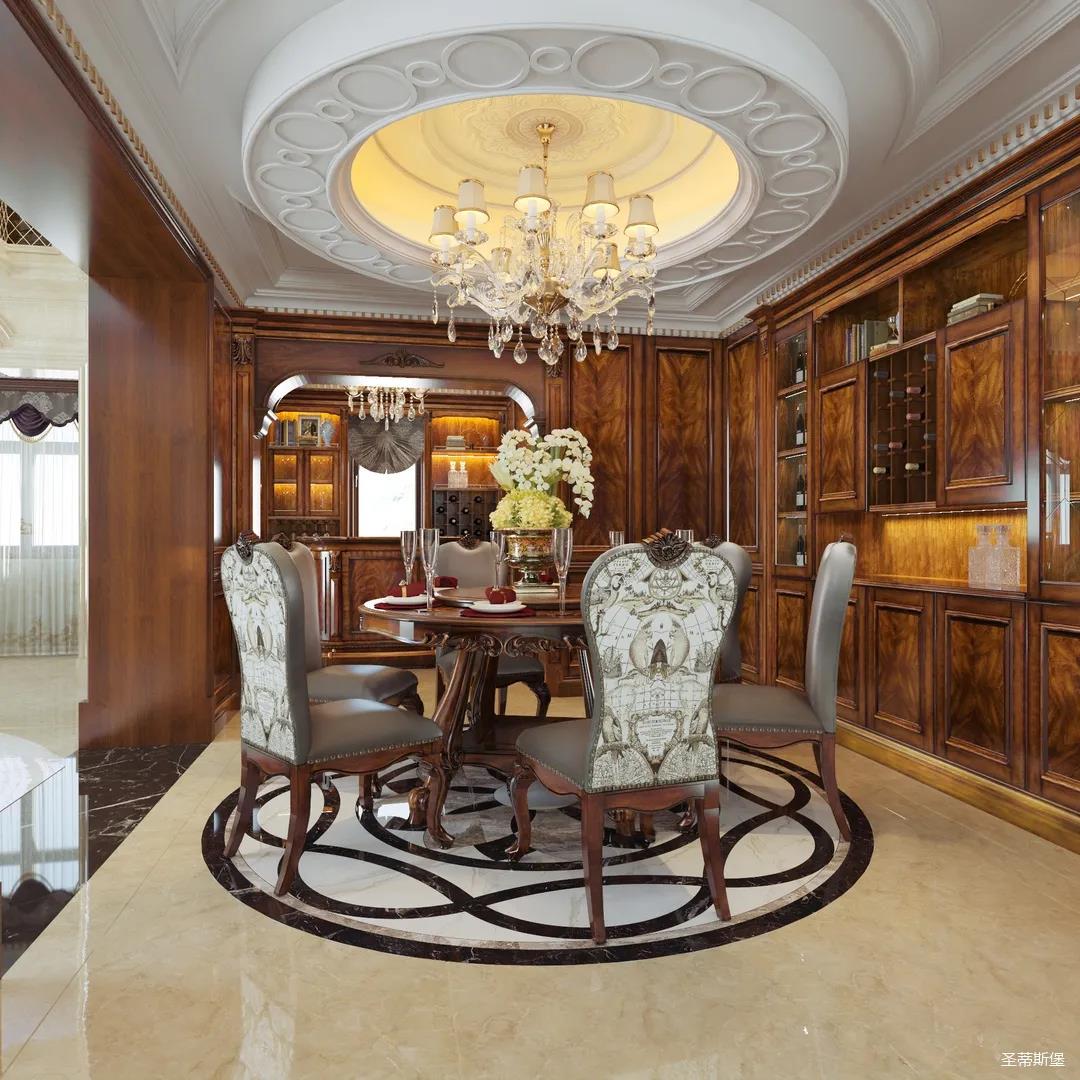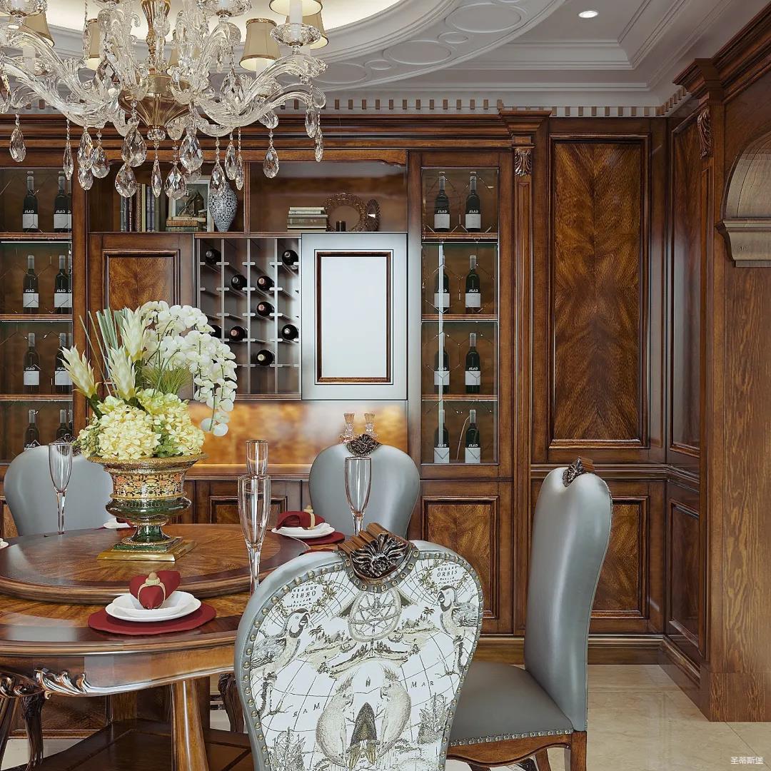 女業主是留美歸來,非常喜歡美式用餐氛圍,設計師以懷舊雅致作為室內基調,整體定制柜與護墻,都透著美式的自然懷舊,即使褪去家具軟裝,僅存留硬體結構,仍透散著優雅純凈的美式韻味。