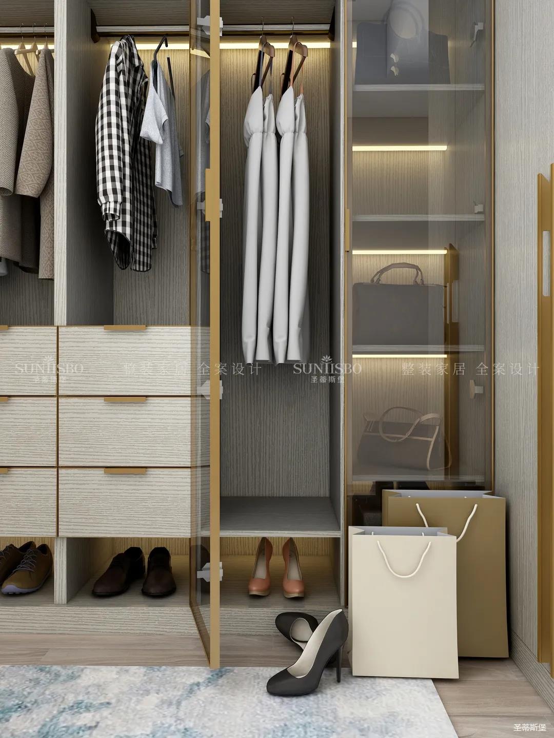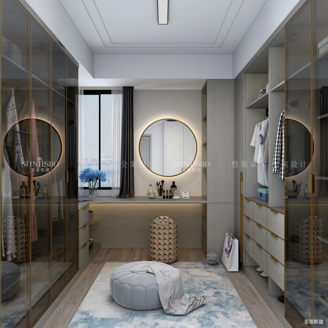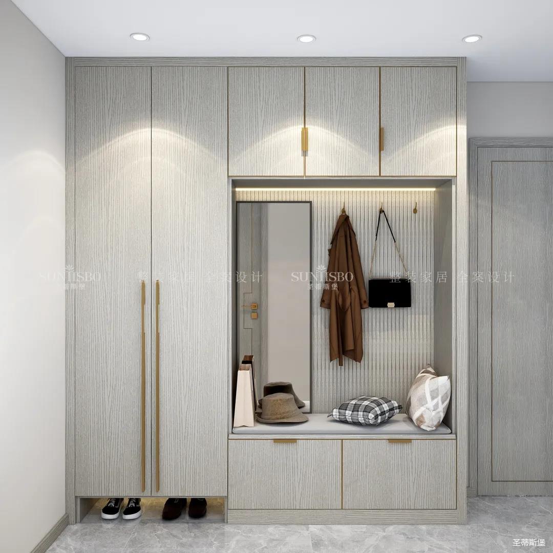進(jìn)入玄關(guān)區(qū)域就能感受到房主對(duì)時(shí)尚風(fēng)格的偏愛(ài),實(shí)木元素與簡(jiǎn)奢金屬的碰撞,既有對(duì)材質(zhì)的甄選,又有現(xiàn)代簡(jiǎn)奢的品質(zhì)感。穿衣鏡、換鞋凳、收納柜等藏漏有序的分區(qū),將屋主的生活歸納的井井有條。