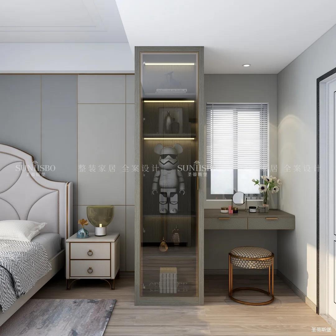 主臥的設(shè)計(jì),整體風(fēng)格與色調(diào)的一致,通過(guò)空間設(shè)計(jì)與軟裝細(xì)節(jié)的調(diào)控,顯得主臥多了一份寧?kù)o與放松。四照花床屏的細(xì)節(jié)、材質(zhì)色彩的把握、隔斷小書(shū)桌的設(shè)計(jì),無(wú)不體現(xiàn)著設(shè)計(jì)師獨(dú)特的品位和全案設(shè)計(jì)的能力。