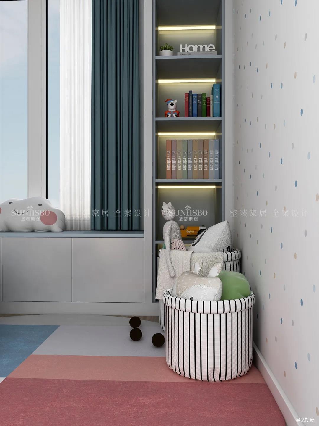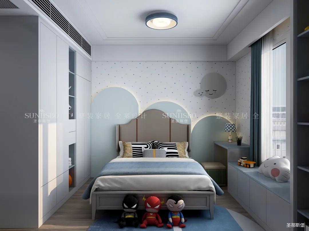 兒童房追求的是童真與自然,柜體的色彩與軟裝搭配完美呼應(yīng),云朵山峰的背景墻,以特立獨(dú)行的設(shè)計(jì)在視覺(jué)上讓心靈得到放空的意境。沿窗打造的飄窗格局,增加空間的功能性,造型簡(jiǎn)約的柜體根據(jù)家裝理念摒棄了繁復(fù)的設(shè)計(jì),更多展現(xiàn)的是空間自然之美。