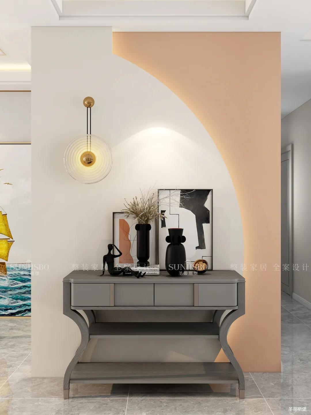 入戶玄關立體抽象裝飾物的擺設,和幾何藝術畫相互搭配,藝術感滿分。黑白色的經典搭配凸顯質感,淺橙與白色墻面間安裝燈帶,既溫暖了入戶氛圍,也增加了空間的層次感。