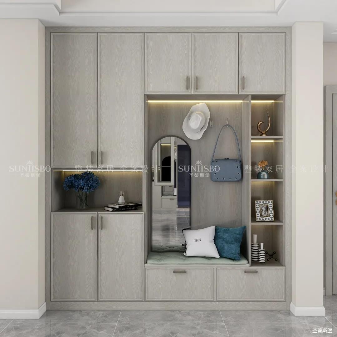衣帽間是女主特別要求的,設計是將房間打造成衣帽間系統,采用L型布局,壁掛式設計,讓穿搭動線更順暢,視覺上也更通透,可直觀的展示女主人穿搭品味。玻璃層板與背板花色的結合,精致靈動,成為時尚與輕奢的寫照,封閉區衣柜的合理格局規劃,完美詮釋現代輕奢風于當代定制中的前瞻性。