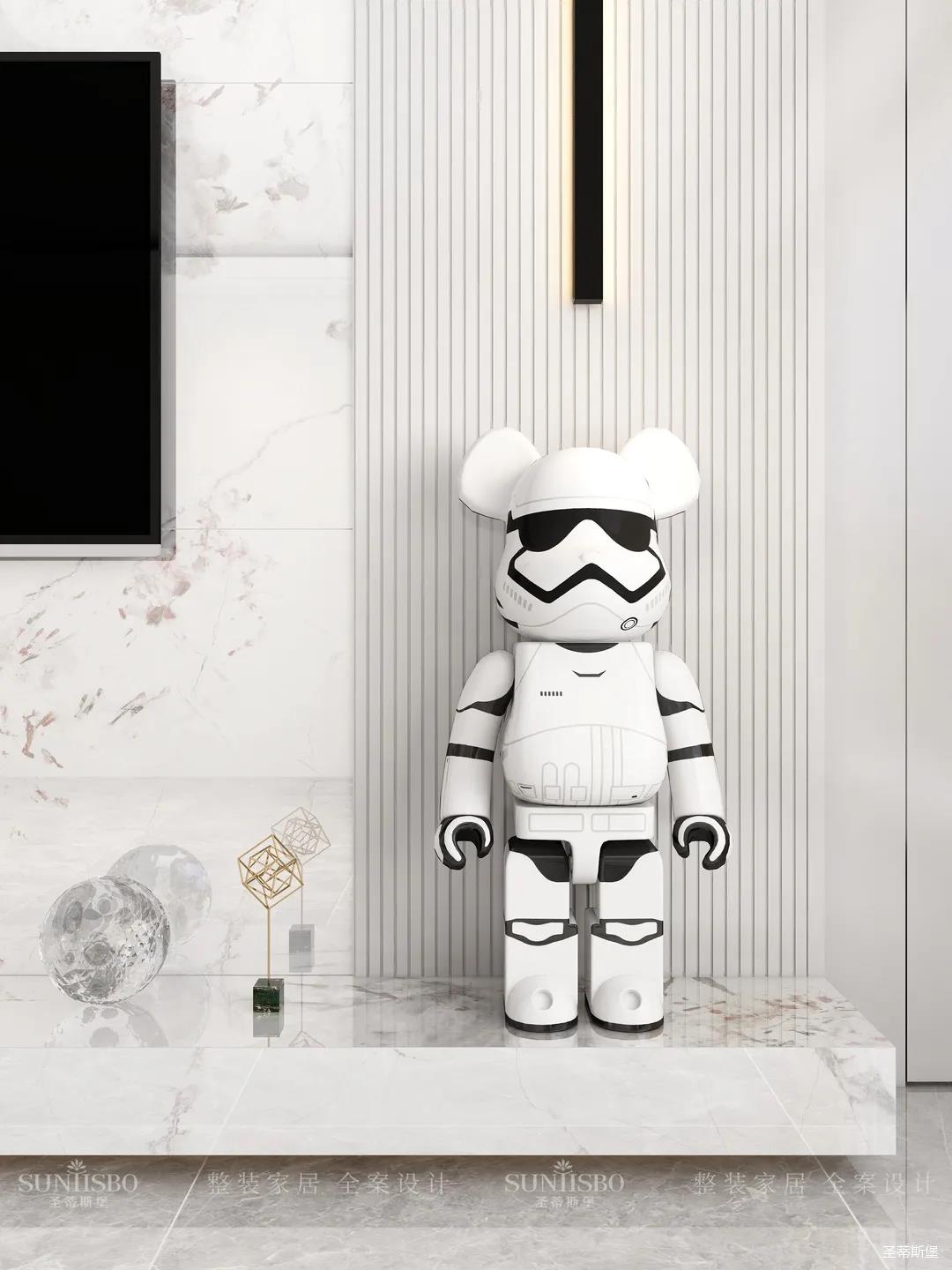 客廳設計置頂展示柜和大理石,實現了現代和輕奢風格間的均衡組合。溫柔莫蘭迪色調的沙發,細節的實木底座和人性化的環抱式設計讓空間更添溫馨的氣息。