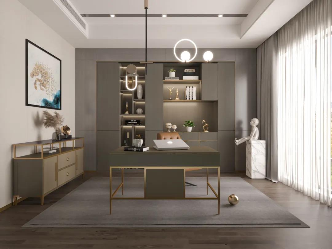 書房用現代手法定制了一個審美與意境并存的閱讀空間,極具生活儀式感。整體嵌入式書柜,用淺灰打底,深灰為框架,讓身心閱讀片刻沉浸。