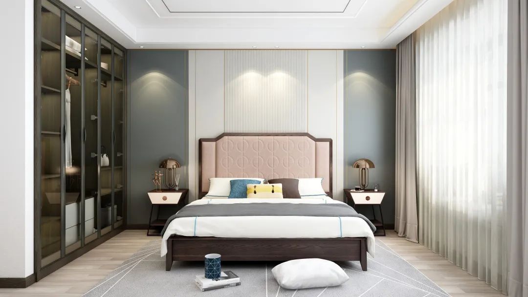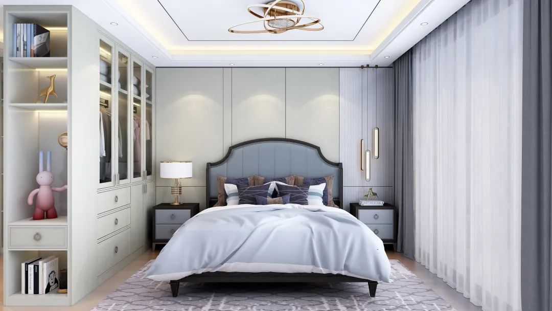 淡藍色也是冷靜色,可以使人更加容易入睡。床屏的邊緣采用了鉚釘鑲嵌,在光線照射下可提亮空間,使床屏看起來更加精致,更有輕奢的高級感。