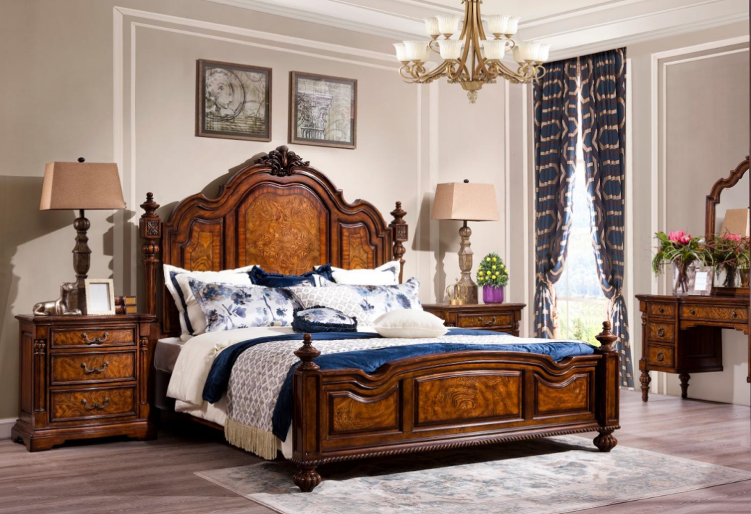 運用實木的制作工藝來體現(xiàn)美式的文化,整個面板采用實木單板鑲嵌工藝,以樹瘤特殊的木紋進行拼接,加上精致的涂裝工藝,給人一種古典、奢華的感覺。