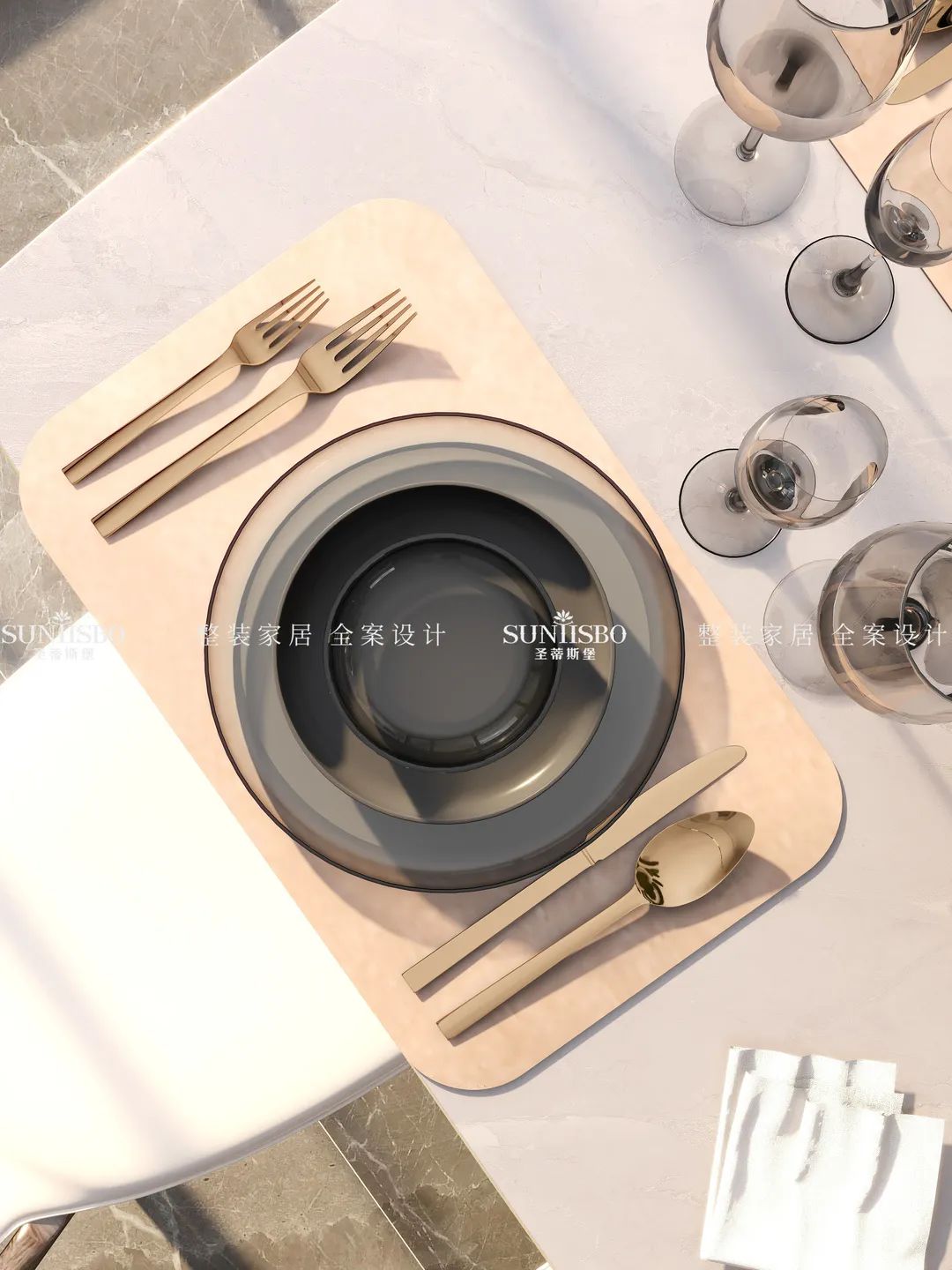 餐廳的設(shè)計(jì)采用整墻定制的餐邊柜,高級(jí)灰讓空間調(diào)性瞬間得到提升,半透明的玻璃展示區(qū),營(yíng)造了多樣的空間和充滿極簡(jiǎn)藝術(shù)氣息的生活體驗(yàn)。