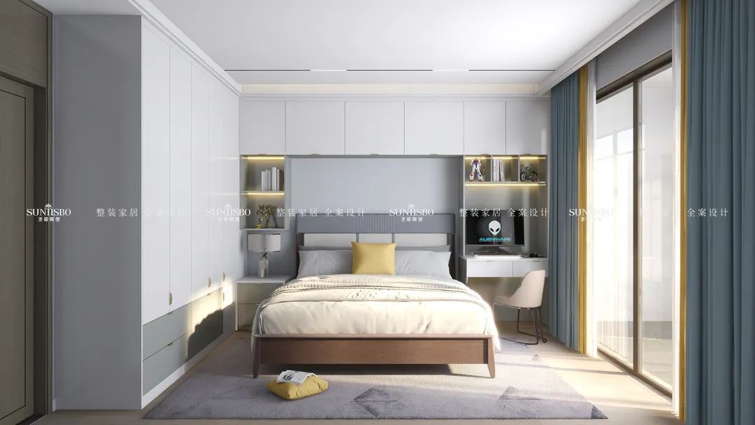 原色的木地板、淺灰的衣柜,搭配簡(jiǎn)約的背景墻,整個(gè)空間都呈現(xiàn)著祥和靜謐的氛圍。游走的光影,絕佳的開闊視野,使得空間充滿無(wú)限張力。黃綠拼接的窗簾,配合柔和的層板燈,營(yíng)造舒適溫馨的起居氛圍。
